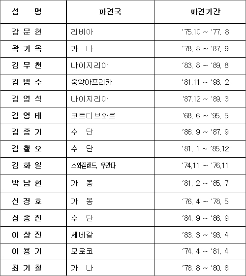 강문현(리비아), 곽기옥(가나), 김무천(나이지리아), 김범수(중앙아프리카), 김영석(나이지리아), 김영태(코트디브와르), 김종기(수단), 김철오(수단), 김화일(스와질랜드), 박남현(가봉), 신경호(가봉), 심종진(수단), 이상진(세네갈), 이용기(모르코), 최기철(가나).