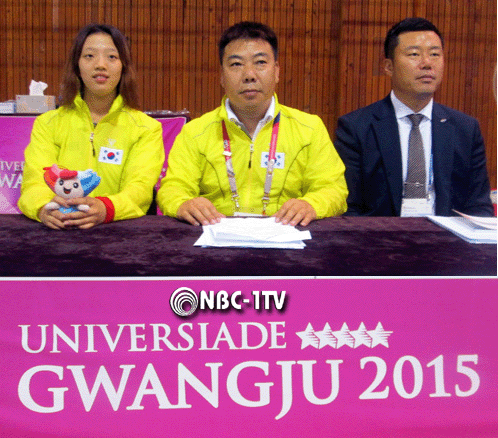 [NBC-1TV 김종우 기자]'2015 광주하계유니버시아드대회' 태권도 마지막 경기가 열리고 있는 조선대학교체육관에서 한국대학태권도연맹 사무국 관계자들(좌로부터 사무주임 백주희, 사무차장 황의호, 의전위원장 최용운)이 한국선수단의 남자부 단체전 경기를 체크하고 있다.