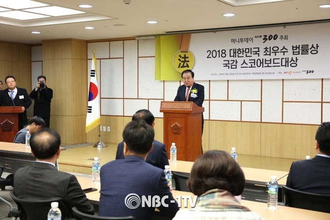 [NBC-1TV 이광윤 보도본부장] 문희상 국회의장은 27일 오전 국회 의원회관에서 열린 「2018 대한민국 최우수법률상과 국감 스코어보드 대상」 시상식에 참석해 축하의 말을 전했다.