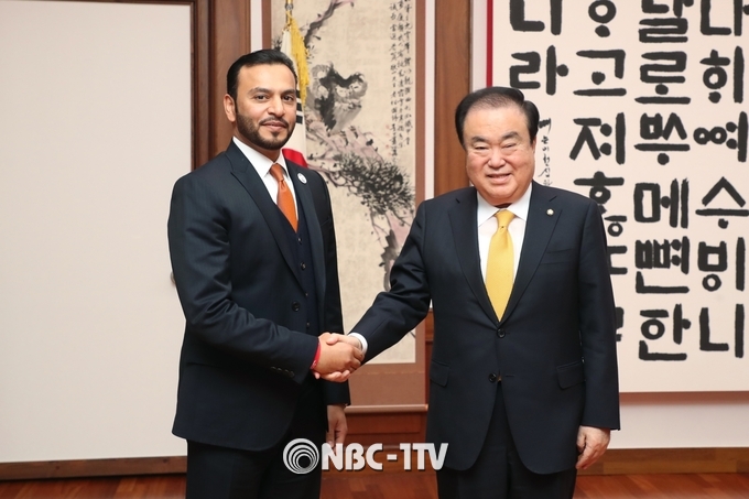 [NBC-1TV 이광윤 보도본부장] 문희상 국회의장은 20일 오후 의장 집무실에서 압둘라 샤이프 알 누아이미(Abdulla Saif Al Nuaimi) 주한 아랍에미리트 대사의 예방을 받았다.