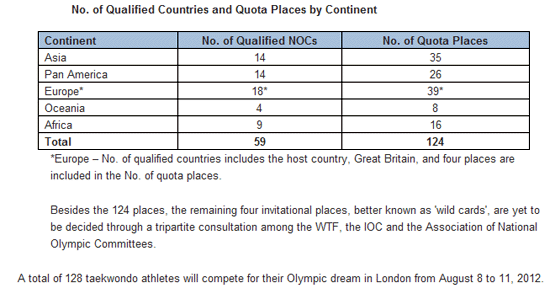 Europe has reaffirmed its dominant position in taekwondo as its 18 member countries have secured 39 places out of 124 for the London Olympic Games, followed by Asia and the Pan American region with 14 qualified NOCs each for their respective 35 and 26 tickets. Africa came next with nine qualified NOCs for 16 tickets, compared with Oceania's four qualified NOCs for eight berths.