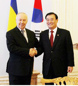 강 의장은 리박 의장과의 면담에서 "세계적 기업인 삼성전자가 대규모 R&D 센터를 우크라이나에 설치해 성공적으로 운영하고 있다"며 "우리 대기업들이 우크라이나의 잠재력에 눈을 돌리고 있다"고 밝혔다고 수행중인 김연광 의장 비서실장이 전했다.