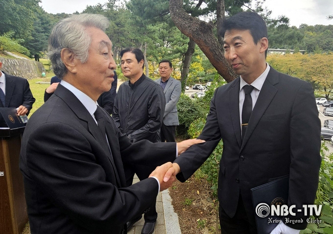 [NBC-1TV 이광윤 보도본부장] 9일 오전, 국립서울현충원에서 엄수된 아웅산 순직 42주기 추모행사 참석한 박상범 전 대통령 경호실장이 강일.국립서울현충원 영현전문경력관을 격려하고 있다.