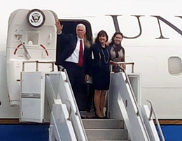[NBC-1TV 구본환 기자]마이크 펜스(Mike Pence) 미국 부통령이 18일, 2박 3일 간의 방한 일정을 마무리하고 다음 순방국인 일본으로 출국하기 위해 오산공군기지에 주기된 전용기에 올라 환송인사들에게 손을 흔들어 인사를 하고 있다.