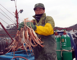 [NBC-1TV 김종우 기자]17일 오후, 구산항에 입항 한 10톤급 대게잡이 어선 '성진호' 선장 김성용(60세 울진 구산리)씨가 자신이 잡은 대게를 들어 보이고 있다.아래의 방송창을 클릭 하시면 NBC-1TV가 지난 2013년 12월 27일 취재 해 28일 방송했던 '동해 겨울바다에서 울진대게 잡는 성진호 동승취…