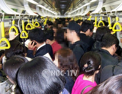 그러나 출퇴근 시간의 전철은 '지옥철'이라는 표현이 맞을 것 같다. 콩나무시루 같은 객차에 남녀가 뒤엉키는 고생은 기본적으로 감수해야하고 탈 공간이 없어 다음 차에 승차하는 승객도 있다. 위 사진의 모습이 우리나라 전철의 자화상 이다.