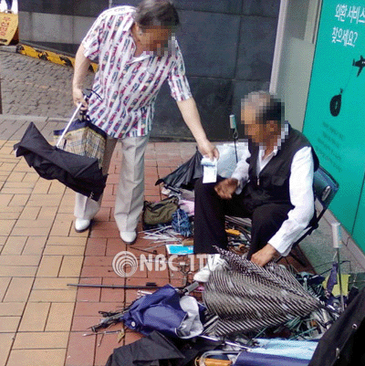 [NBC-1TV 김종우 기자]13일 오전, 서울 지하철 OO역 앞 노상에서 한 할아버지가 우산 수선업을 하고 있다. 비 내리는 날이 많아서인지 할아버지를 찾는 손님이 줄을 이었다.