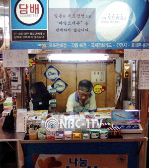 [NBC-1TV 김종우 기자]일본의 독도 관련 망언에 대해 반일 감정이 확산되고 있는 가운데, 6일 오전 서울 강남고속터미널 경부선 대합실 내의 가판에서 담배를 팔고 있는 한 상인이 "일본의 독도 망언으로 마일드 세븐을 판매하지 않습니다"는 안내문을 붙이고 영업을 하고 있다.