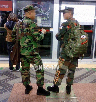 [NBC-1TV 김종우 기자]5일 밤, 서울 지하철 2호선 신도림역에서 전철을 기다리는 한 해병의 군복에 승객들의 눈길이 모아졌다. 병사의 바지에 새겨진 "날 죽이지 못할거면 날 건드리지마라!"는 문구 때문이다.
