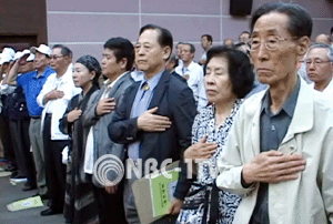[NBC-1TV 김종우 기자]'봉오동전투 전승 제92주년 기념 국민대회'가 7일 오후 2시 서울 창신동 종로구민회관에서 여천 홍범도 장군 기념사업회(이사장 이종찬) 주관으로 엄수되고 있는 가운데 참석자들이 국민의례를 하고 있다.