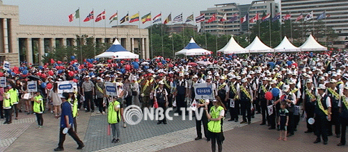 [NBC-1TV 박승훈 기자]23일 오후 5시 용산 전쟁기념관에서 서울광장까지 약 3.7㎞를 걷는'호국퍼레이드'앞서 참가자들이 애국가를 부르고 있다.