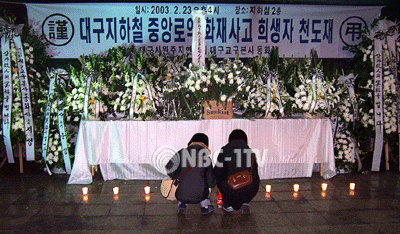 [NBC-1TV 김종우 기자]10년 전인 2003년 2월 18일 오전 9시53분에 발생했던 대구지하철 참사 현장된 임시 빈소에서 시민들이 분향하고 있다.