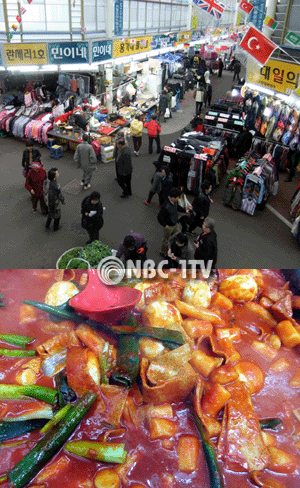 [NBC-1TV 김종우 기자]짚세기에서 바라 본 중앙시장의 명물인 노점상(원안이 떡볶이집)과 먹음직 스러운 떡볶이(下). 우리나라의 대표적인 전통 재래시장인 대전중앙시장의 정겨운 풍경, 대전광역시 원동 위치한 이곳은 중앙시장시장 상인연합회(회장 구범림)를 중심으로 재래시장 활성화에 최선을 다하고 있다.