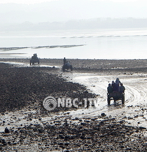 [NBC-1TV 김종우 기자]19일 오후, 5년전 기름 유출 피해를 입었던 의항1구(충남 태안군 소원면) 해변에서 어민들이 바지락을 채취(採取)를 위해 경운기를 타고 바다로 향하고 있다.