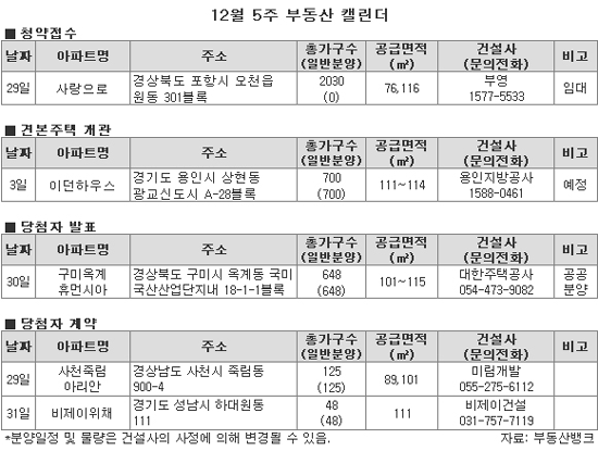 12월 마지막 주에도 일반분양 물량이 단 한 곳도 없는 것으로 나타났다. 새해에는 용인지방공사가 광교신도시 내에 청약을 앞두고, 내년 1월 3일 견본주택을 선보인다. 특히, 이 단지는 최근 정부의 부동산 규제 완화로 전매제한 기간이 5년에서 3년으로 단축될 예정이어서 수요자들의 눈길을 끌고 있다. 자세한 사항은 오늘(26일) 모집공고를 통해 확인할 수 있으며, 내년 1월 6일부터 순위내 청약접수를 시작한다.