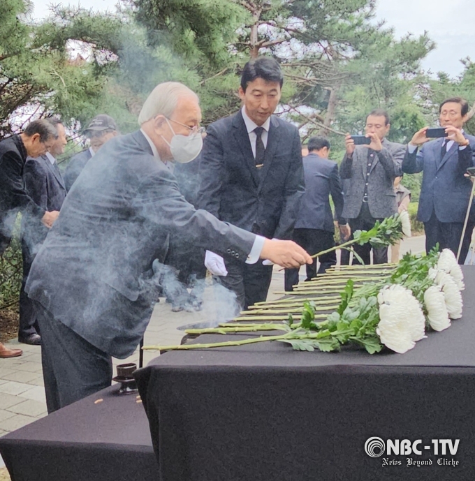 [NBC-1TV 이광윤 보도본부장] 9일 오전, 국립서울현충원에서 엄수된 아웅산 순직 42주기 추모행사 참석한 장세동 전 경호실당이 순국한 전직 대통령  경호관 한경희 정태진 두 경호관 묘소에 헌화하고 있다.