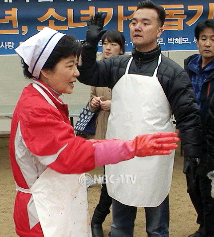 [NBC-1TV 박승훈 기자]26일 오전 서울 도봉구 쌍문동 창경초등학교에서 열린 '제4회 청소년 가장 돕기 사랑의 김장담그기'행사에 동참한 박근혜 한나라당 전 대표가 김치 포장 박스가 부족하자 재미있는 제스처를 하고 있다.
